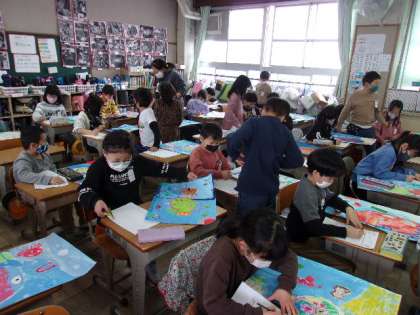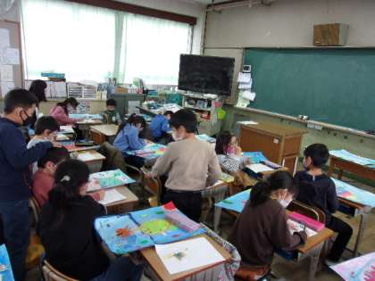 今日は自分の絵を振り返りながら、友だちの絵についての感想もプリントに書いていました。