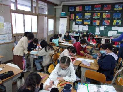 調べるテーマにそって、それぞれ違う教室に集まって学習作業を進めていました。