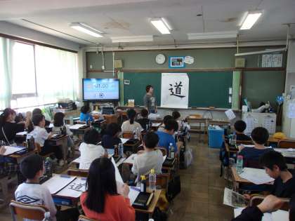2組は書写で、毛筆に取り組んでいました。文字の組み立て方と穂先の動きに気をつけて『道』を書きました。