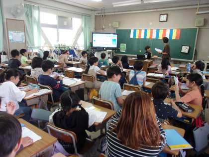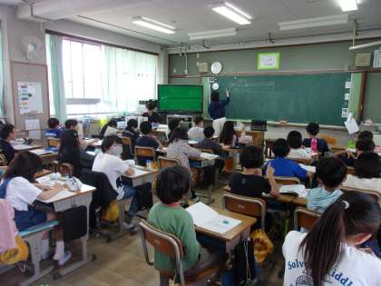 2組は算数で、大きな数を学習していました。位がわかりやすい工夫のある黒板で、大きな数の書き方を確認していきました。