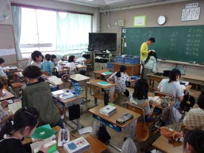 2組は宿題の答え合わせをしていました。ノートのマス目に合わせて先生が作った答えと照らし合わせて確認していきました。