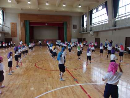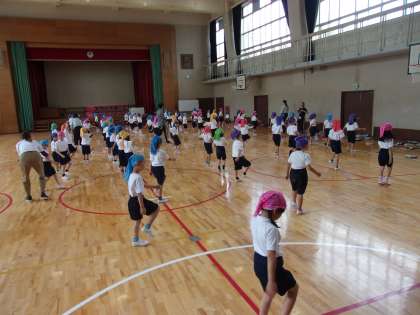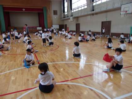 運動会の団体演技の練習に取り組んでいました。先生の話をよく聞いて、道具の使い方、出すタイミング等を確認していました。色とりどりでとてもよい雰囲気です。