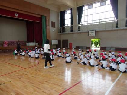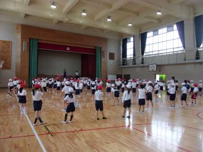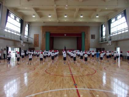 体育館で団体競技の並び方を確認していました。その後は、団体演技の練習に取り組みました。