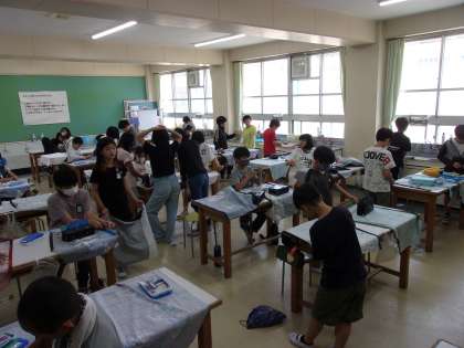 3組は家庭科で、アプロンの製作に取り組んでいました。アイロンを使って折り目をつけたり、しつけ縫いをしたりと、一つ一つの行程に取り組んでいました。