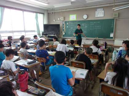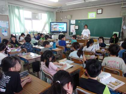 2組は理科で、『地面を流れる水のゆくえ』の学習に取り組んでいました。雨の後の運動場がどのようになっているのかを思い出して発表していました。
