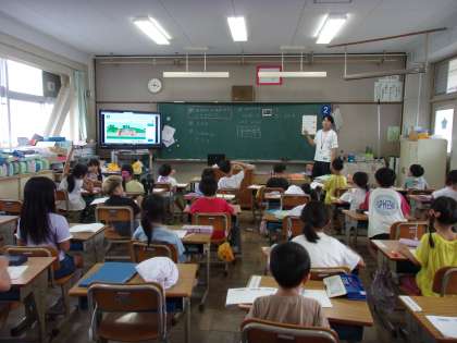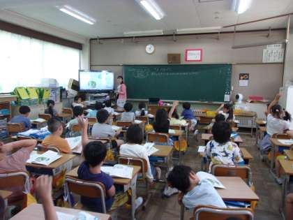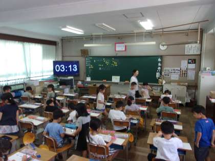 1組は算数で、お話に合わせて5−2+4の式を立てて計算していました。どの子の説明がいいか、ノートを見合いながら探していました。