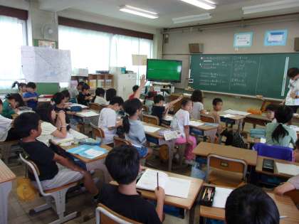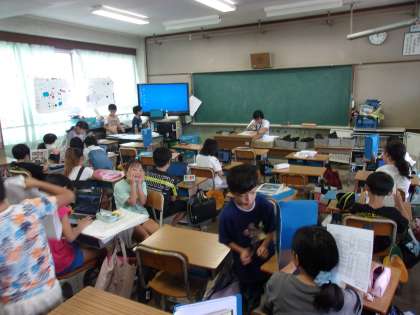 1組は理科のテストをしていました。終わった人からタブレットを使って総合的な学習の調べ活動をしていました。