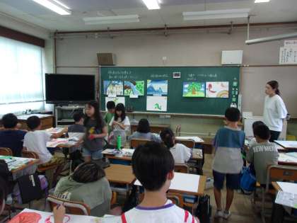 3組は図工で、詩の絵を描いていました。水をの量を考えて透明感のある色を作ったり、筆の使い方を工夫したりして描いていきました。