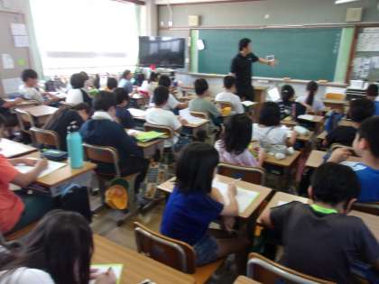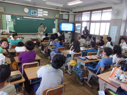 2組は外国語で、できることやできないことをたずね合う学習に取り組んでいました。この学習をふまえて日置荘小学校の先生クイズを作ってくれるようです。