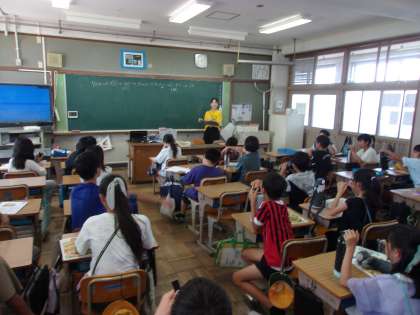 1組は学活で、臨海学校のことをふりかえっていました。楽しかったところ、できたところ、改善した方がいいところなどをしおりに書き込んで、発表しました。