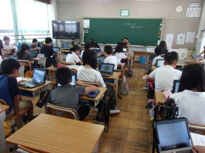3組は図工で、『日本×新幹線』の絵に取り組んでいました。まずはパソコンを使ってイメージ図を作成しました。さまざまなアイデアが出ていました。