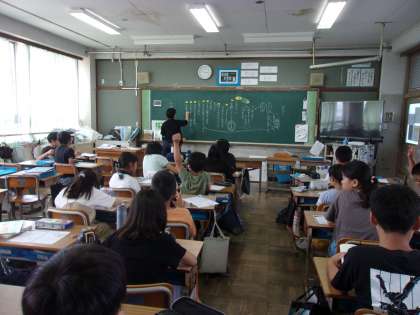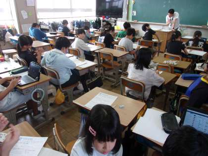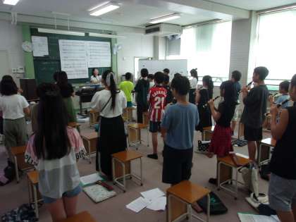 3組は音楽で、『海の声』の合唱とリコーダー奏に取り組んでいました。臨海学校に行った後なので、海の声、風の声のイメージを持ちながら歌っているように思いました。