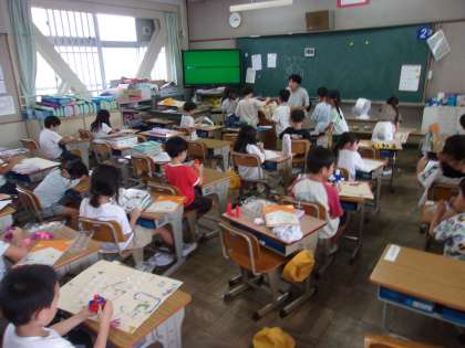 2組は図工で、『おむすびころりん』の絵を描いていました。クレパスはだんだん完成に近づいてきて、出来た人は先生に見せに行っていました。