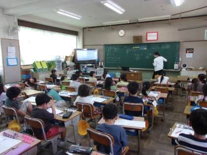 3組は算数で、7+8の計算の学習をしていました。7を2と5にわけても、8を3と5に分けても10+5=15になることを知り「ふしぎ〜」という声があがりました。