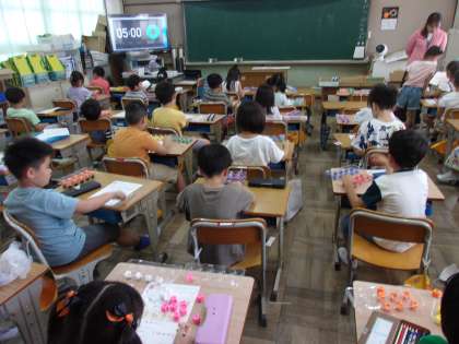 2組は算数で、3+9や9+4の計算に取り組んでいました。どちらの数字をサクランボにするかを考えて計算していました。