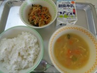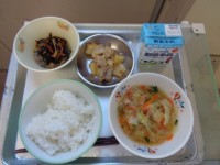 ・牛乳・ごはん・野菜たっぷりすまし汁・豚肉のみそマヨガーリック焼き・ひじきの甘煮...