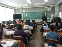 それぞれの班で集まり、3クラスに分かれて防災新聞の作成に取り組んでいました。地震...