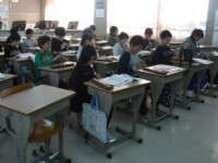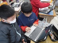 卒業文集の仕上げをしています。完成した作文を,友だちと読みあって推敲しています。...