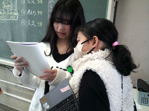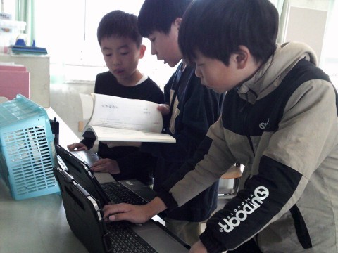 銀色の裏地の学習をしています。みんなで出し合った疑問を解決するために交流しています。