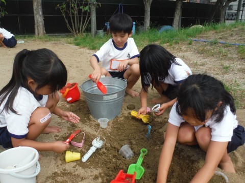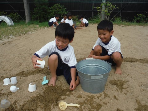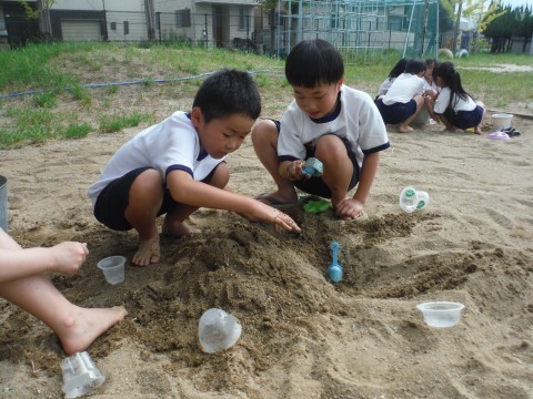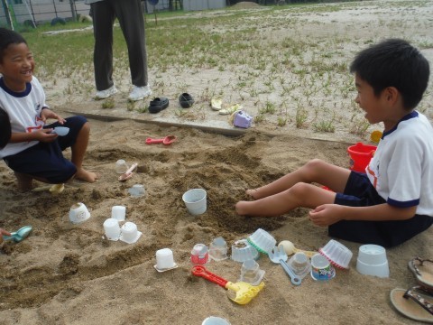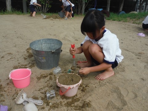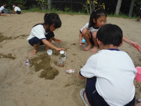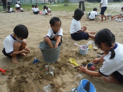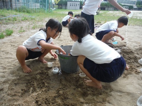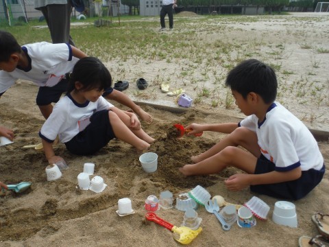 生活「どろんこあそび」の学習です。ヨーグルトやゼリーのカップを使ったり,山を作ったり,川を使ったりして遊びました!班で協力したり,思い思いに遊んだりする姿が見られました☆