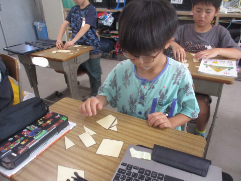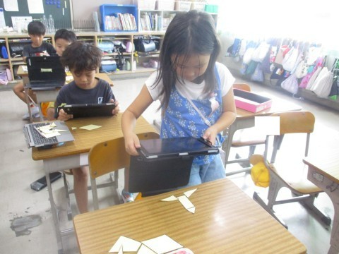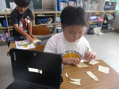 算数の時間では,たくさんの形を合わせて船や家をつくってみる活動をしました!できた形をタブレットで撮影して,答え合わせもしました♬