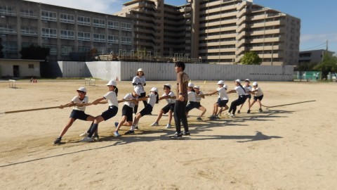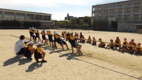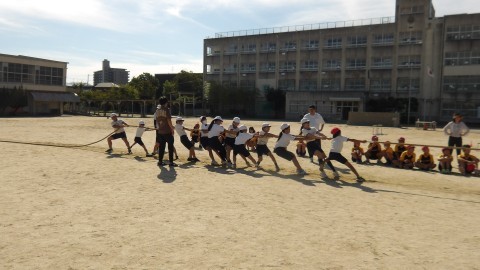 壮行会のあと,5年生と綱引きのテストマッチを行いました。