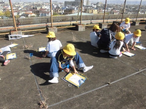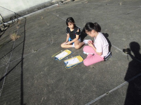 理科の「太陽とかげの動き」の学習で、屋上に上がって、ストローの影の動きを時間ごとに記録し、太陽の位置はどう変わるのかを観察しました。