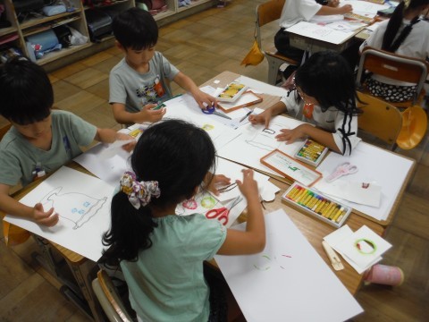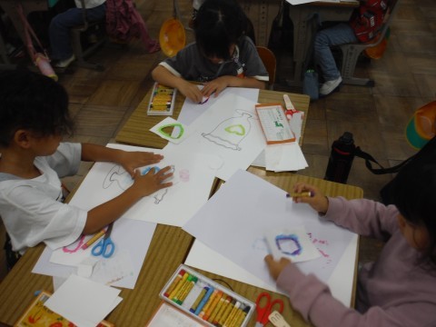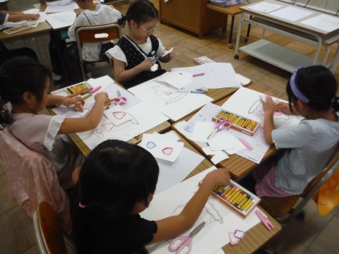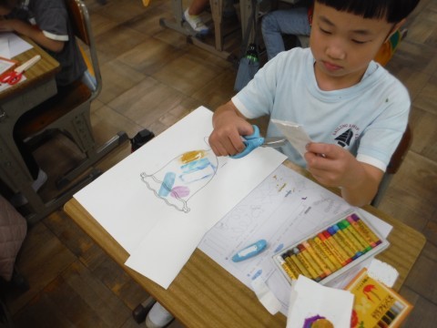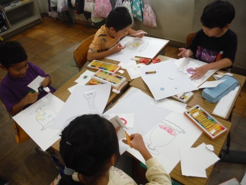 図工の学習です。今日は,カラフルパフェを作りました!クレパスを使って「ステンシル」という技で描きました!!カラフルなパフェができそうです☆