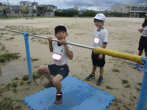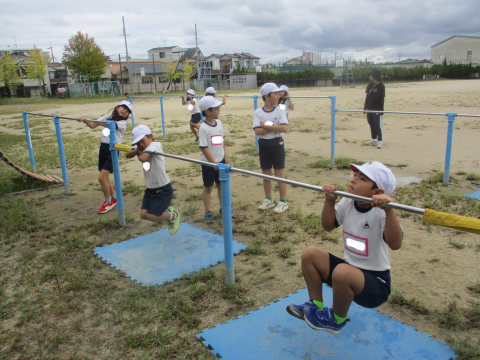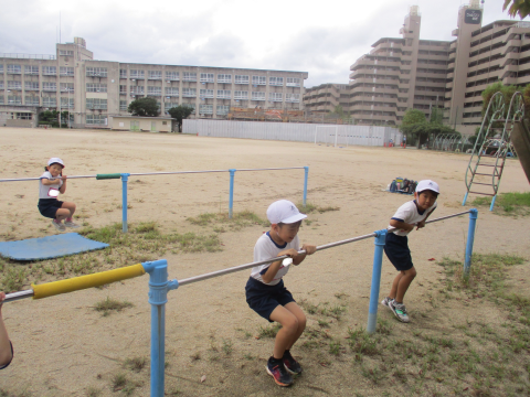 体育では鉄棒をしています!今日は,逆上がりの前段階として「ミノムシ耐久レース」をしました♬子どもたちにはミノムシという言葉は通じなかったです,,