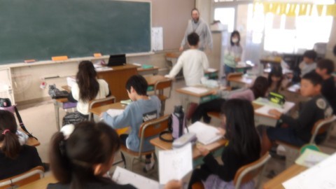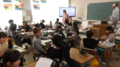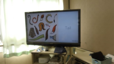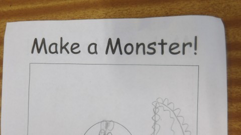 モンスターの指定されたパーツを描いて,隣の子にプリントを回します。