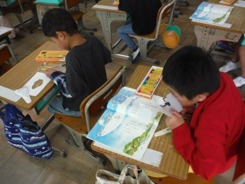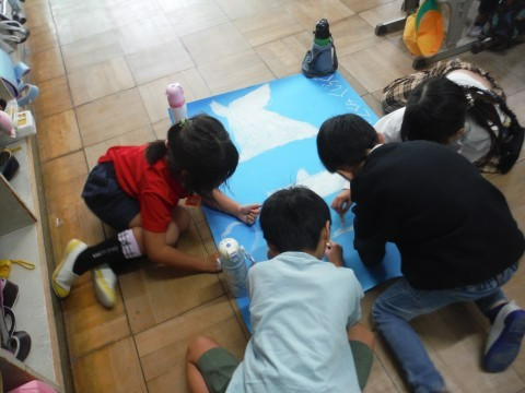 図工の学習です。くじらぐもに乗っている自分を考えて描きました!!同時進行で,くじらぐもにも色を塗りました☆出来上がりを楽しみにしていただけたらと思います!!