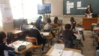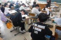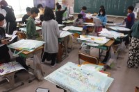 図工では、くぎ打ちの学習で「コリントゲーム」を制作しています。今は下絵を描いた後、ボードにネームペンでなぞり絵の具で色を塗っています。点数をゲットできるスペースを作り、子どもたちは完成後遊ぶのを楽しみにしています。