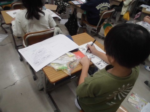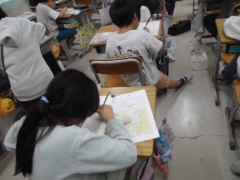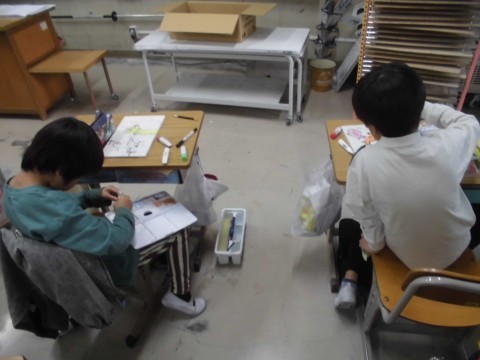 図工では、くぎ打ちの学習で「コリントゲーム」を制作しています。今は下絵を描いた後、ボードにネームペンでなぞり絵の具で色を塗っています。点数をゲットできるスペースを作り、子どもたちは完成後遊ぶのを楽しみにしています。