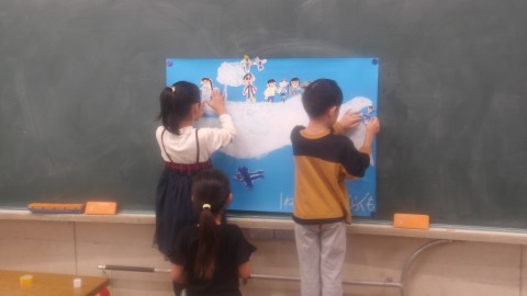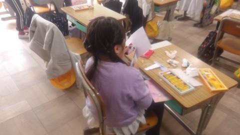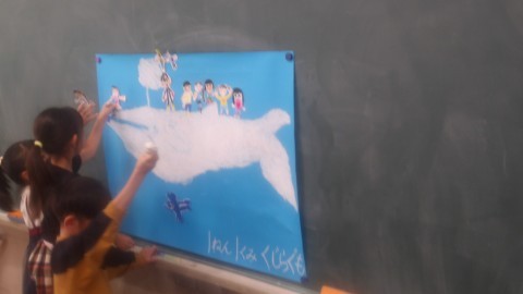 自分の絵を描いて切り取り,くじらぐもの絵に乗せていました。