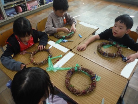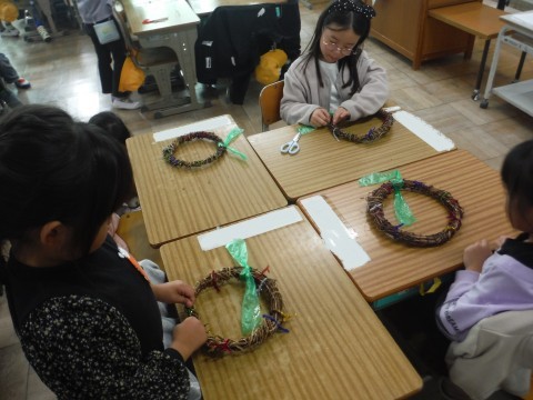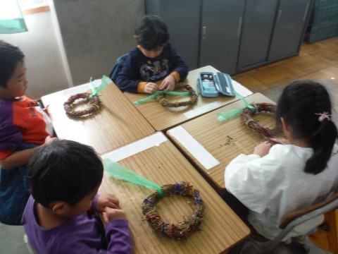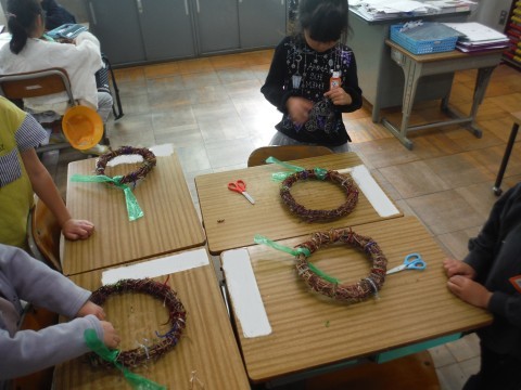 10月30日(木) 1年2組 公開日 2025/10/30 更新日 2025/10/30 1年生 図工「あさがおリースづくり」です。参観で,リースづくりをするので,その準備として,リースからはみ出ているつるをおさえるためにモールをまきました。どんなリースになるか楽しみですね☆ +2