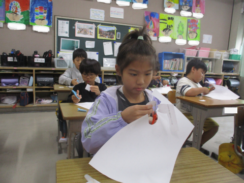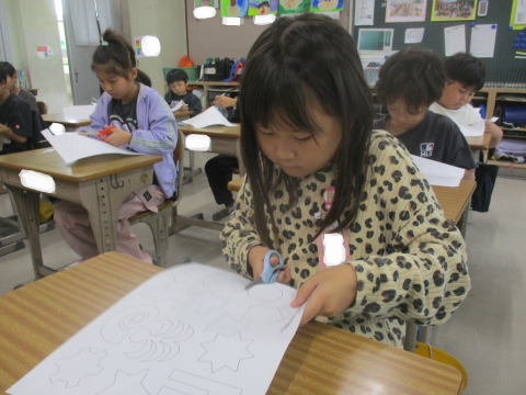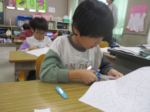 図工では,「はさみの使い方」について学習しました!はさみを前に向けること,紙を動かすことを意識して練習シートを切っていました♬