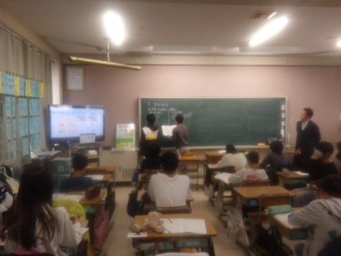 二人の子が黒板に向かって,設問に対する回答を書いていました。