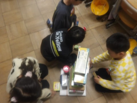 教室をのぞくと,グループで箱を高く積み重ねていました。