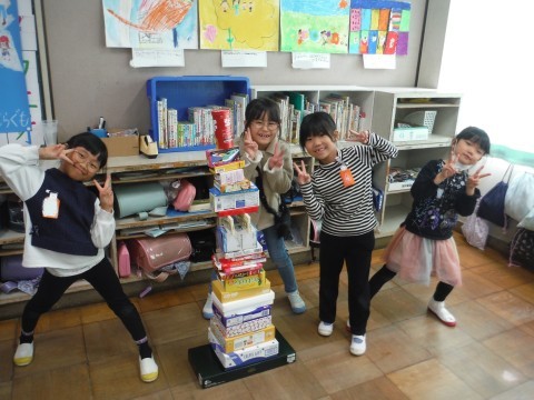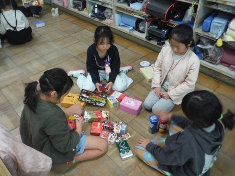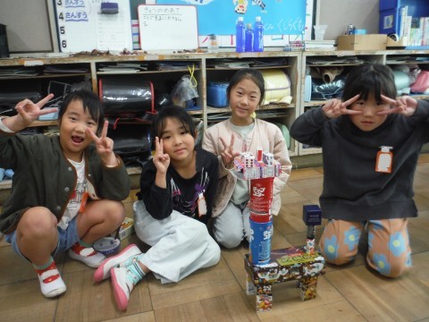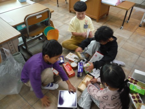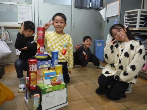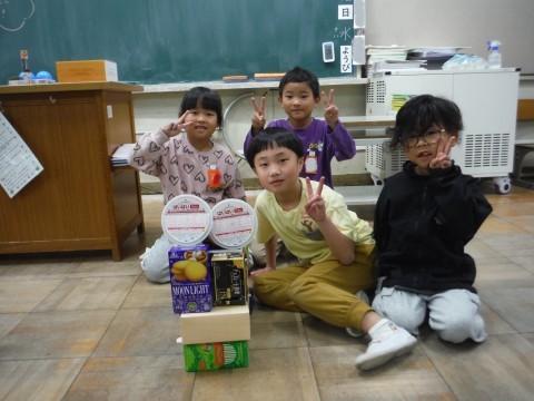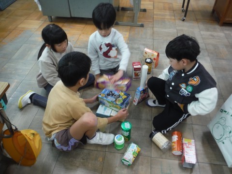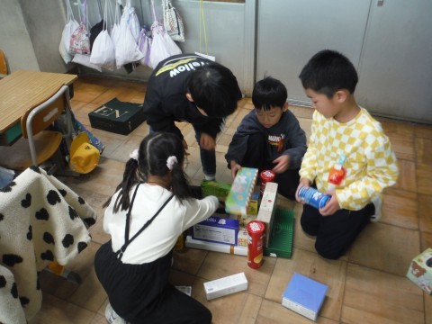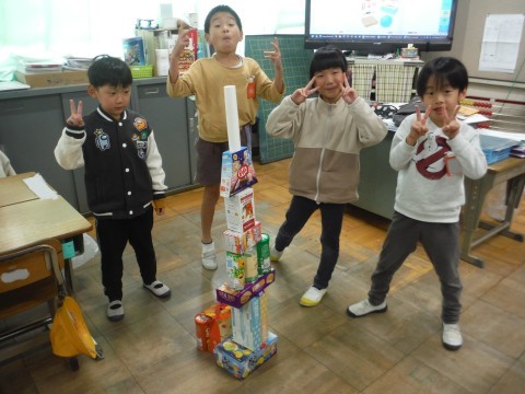 算数「かたちあそび」の学習です。集めてもらった箱を使って,いろいろなものを作りました!タワーや,きりん,お城などを作っていました☆班で協力したり,譲り合ったりすることも学ぶことができました!!形に注目して,積み上げることができました☆