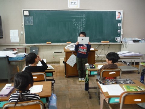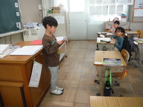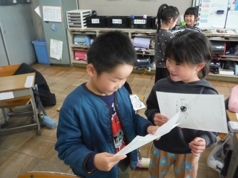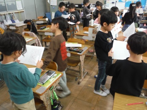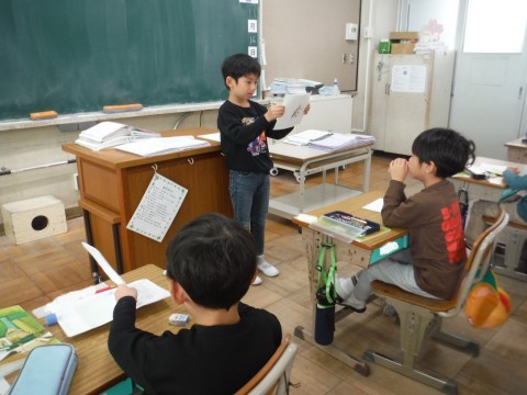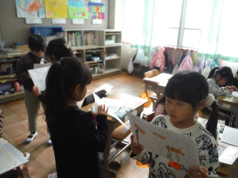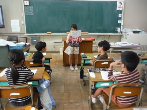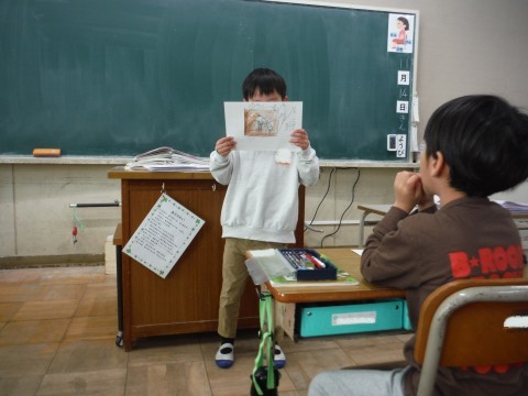 11月14日(金) 1年2組 公開日 2025/11/14 更新日 2025/11/14 1年生 国語「しらせたいな,見せたいな」の学習です。完成した絵を見せながら,文を発表しました。少し緊張しながらもしっかりと発表できました☆もう少し詳しくみるために,読みあいました!持って帰っているので,ぜひお家でも聞いていただけたらと思います☆ +5