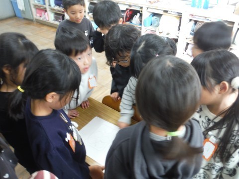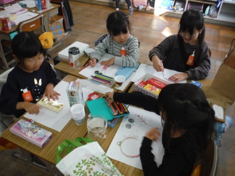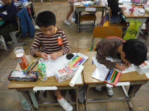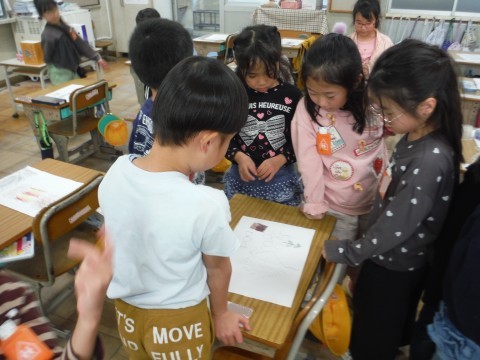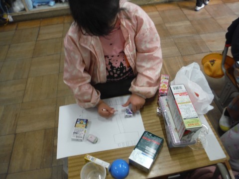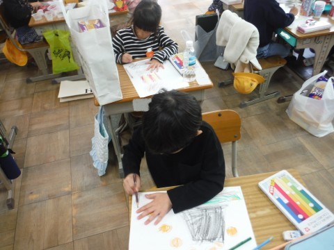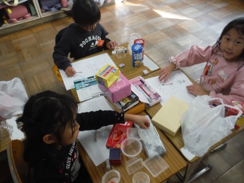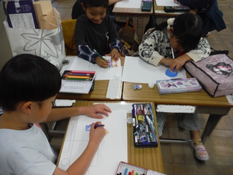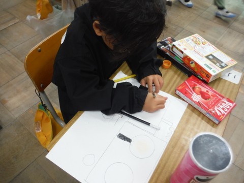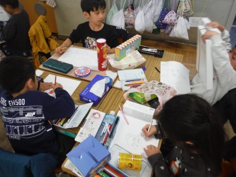 11月14日(金) 1年2組 公開日 2025/11/14 更新日 2025/11/14 1年生 算数「かたちあそび」の学習です。今日は,箱の形を使って,絵を描きました。丸や四角などをつかって描くことができました☆できた絵を形に注目しながら見ることができました☆ +7