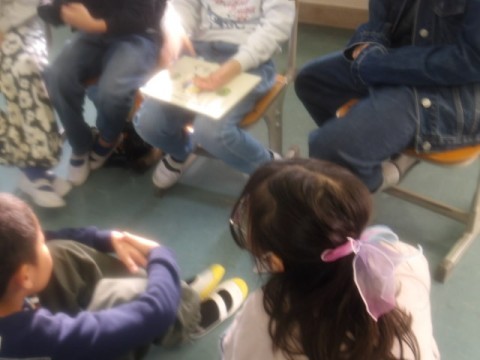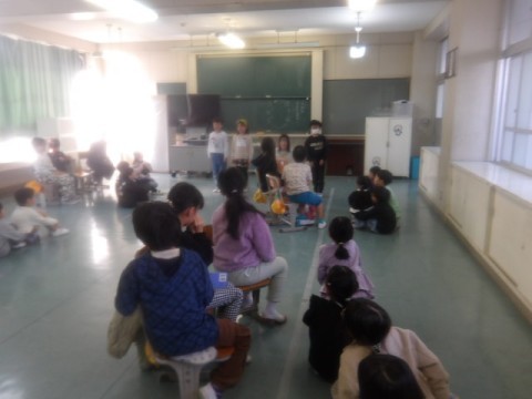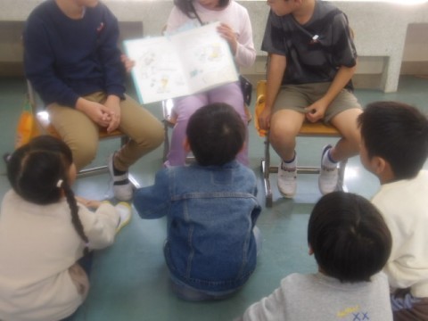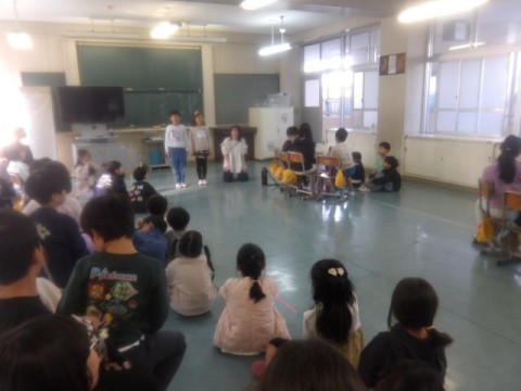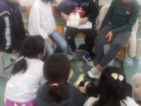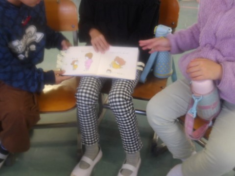 多目的室で1年2組さんを招待して「よみきかせ会」を開催していました。