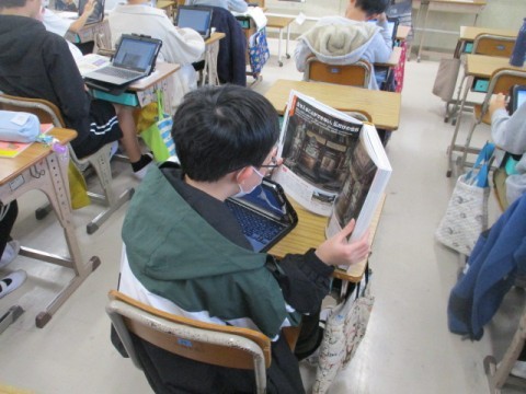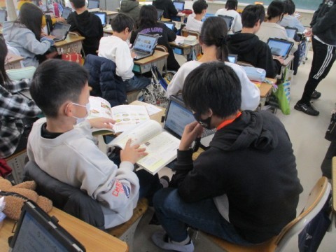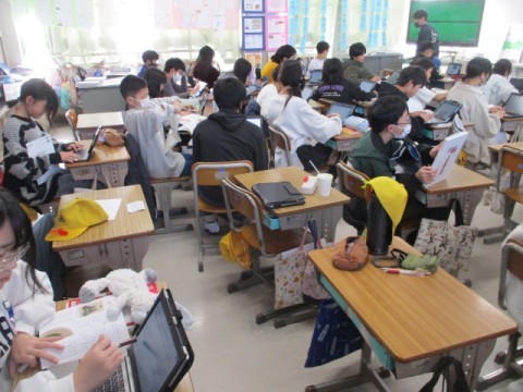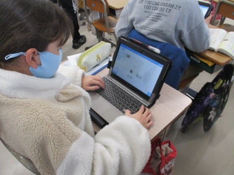 国語の学習です。調べたことの魅力を伝える文章を書いていました。どんな工夫をすれば魅力が伝わるのか考えながら,取り組んでいました。