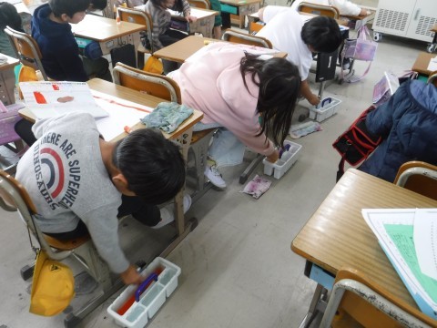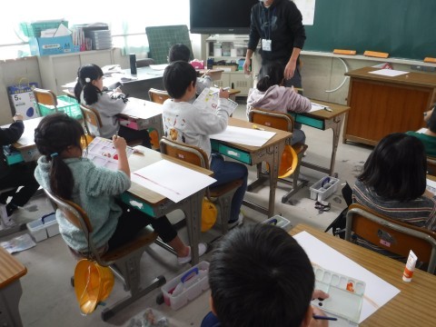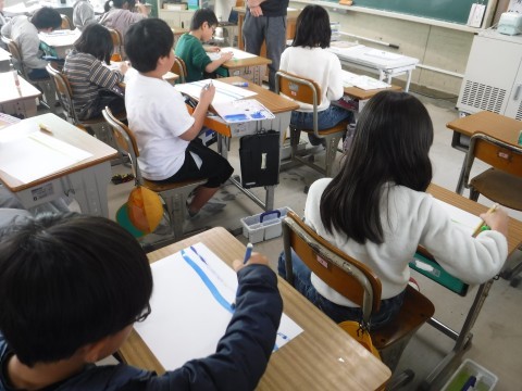 水入れでの筆の洗い方や,パレットの使い方,線の引き方など,基本の練習をしました。
