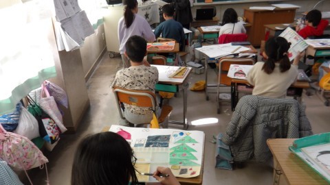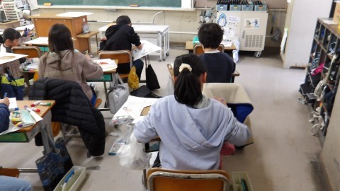 図工の時間で,顔をはめる絵を描いていました。