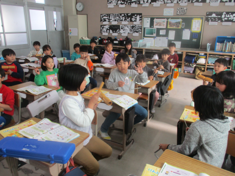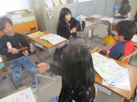 音楽の授業の様子です!自分で選んだ打楽器で,音の会話をしました!初めはグループで,その後にクラス全員で音の会話をしました♬