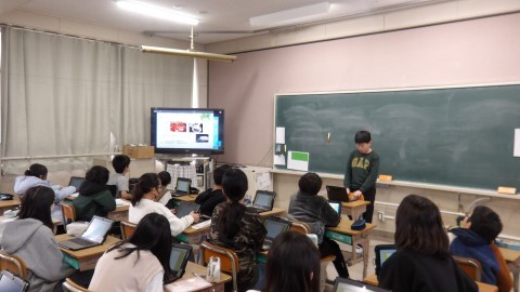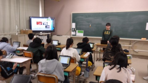 冬休みの課題として調べてきた内容をパワーポイントで発表していました。