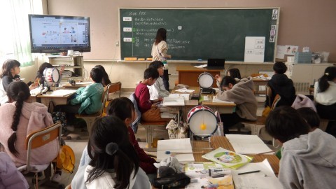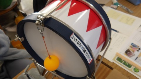 実験用の太鼓を使用して,「ふるえ」の違いを調べていました。