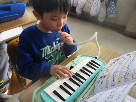 「タンブリンのわ」を鍵盤ハーモニカで練習しはじめました!鍵盤を押すタイミングがむずかしい様子でした!