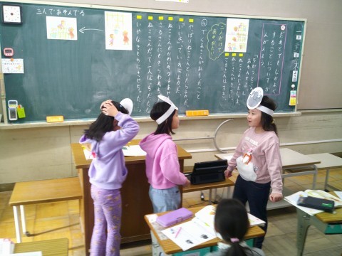最後には登場人物の3人になりきって、どんなお話をしたのか考えて演じてみました。
